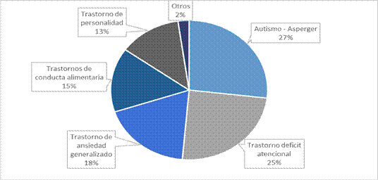 Entre las ND más mencionadas encontramos el Trastorno de Ansiedad Generalizado y el Trastorno de Déficit Atencional. En tercer lugar, las/os docentes señalan que habitan el Autismo, mientras que las/os estudiantes mencionan los trastornos de conducta alimentaria. Las figuras 4 y 5 presentan el detalle correspondiente.